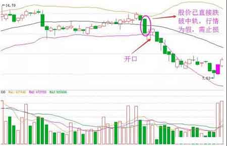 开口代表着市场的启动。每个人都喜欢这种不断上升的市场,但是一个好的市场不可能一夜之间实现。此时,它需要在进入市场前得到有效的确认。通过以上对布林线开通的理解,我们的止损技术是将止损位置放在中间轨道上方一点。一旦股价在回调过程中跌破中间线,我们可以看到当前市场是错误的。