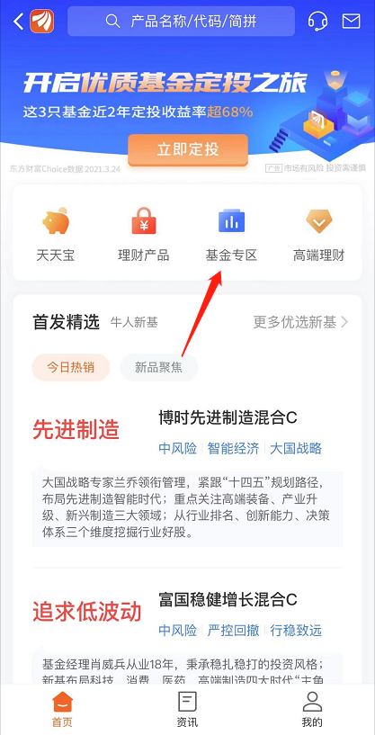 第一步:打开东方财富首页,点击【基金】—【基金专区】。