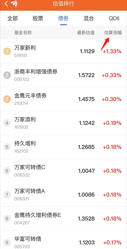 第三步:点击【债券】,就可以看见债券型基金的估算涨幅了。