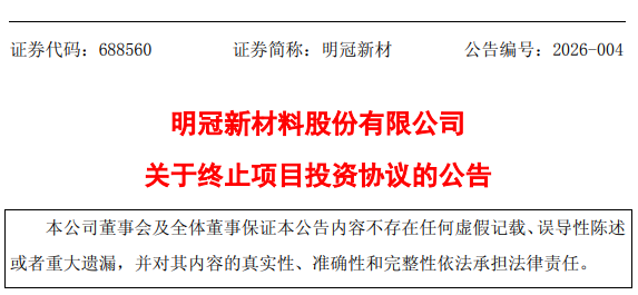 明冠新材(股票代码:688560)是一家专注于新能源电池封装用高分子材料研发、生产及销售的高新技术企业,成立于2007年,2020年12月在上交所科创板上市,是宜春市经开区培育的首家科创板上市企业。2月8日,明冠新材发布关于终止项目投资协议的公告。