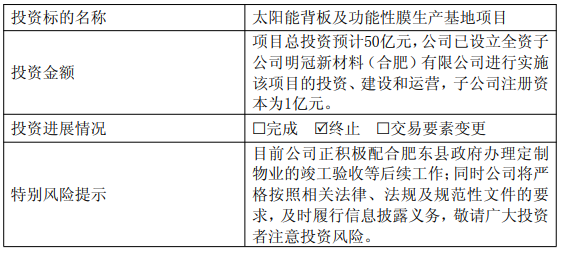 由于外部客观条件及行业环境发生了变化,本次终止项目投资是明冠新材基于长远发展战略所作出的审慎决策。本次协议签署尚需明冠新材股东会审议通过,相关协议的具体内容以最终协议为准。目前,明冠新材正积极配合肥东县政府办理定制物业的竣工验收等后续事宜。明冠新材将严格遵守相关法律法规及规范性文件的要求,及时履行后续事项的信息披露义务。敬请广大投资者注意相关投资风险。