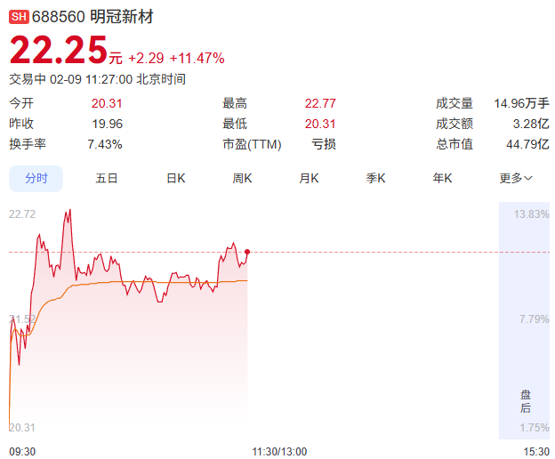 2月8日,明冠新材发布关于终止项目投资协议的公告后,次日股价上涨。2月9日,明冠新材的股票以20.31元/股开盘,与2月6日(周五)的收盘价19.96元/股相比,上涨了0.35元/股,涨幅为1.75%。开盘后,明冠新材的股票持续上涨,最高涨到22.77元/股。截至写稿时(11:27),明冠新材的股价报22.25元/股,涨幅为扩大至11.47%。